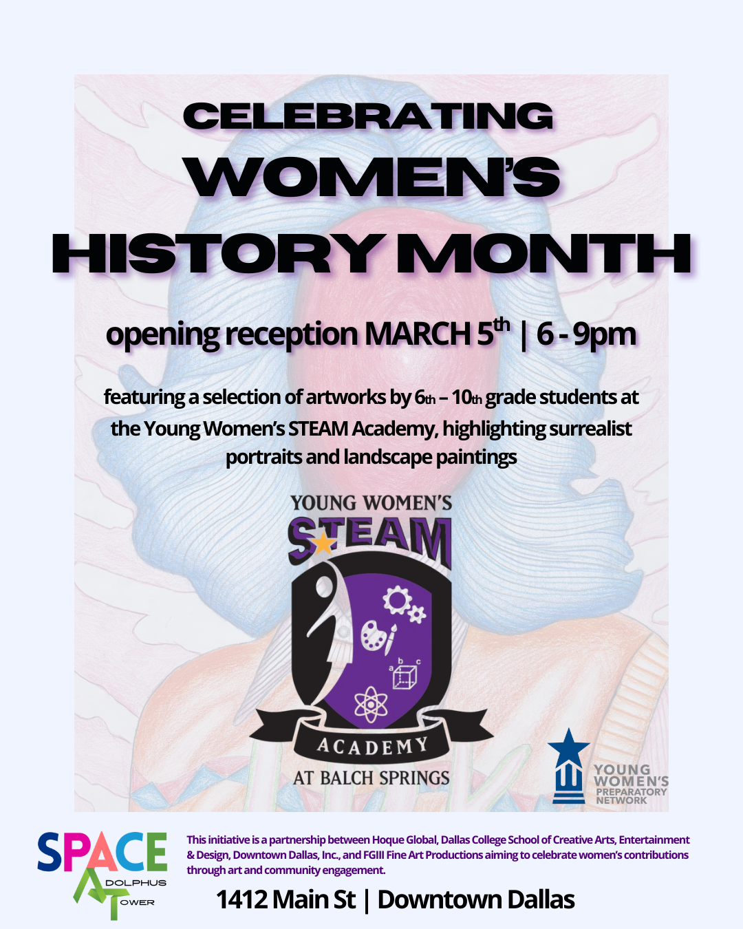 A satellite exhibition, celebrating Women's History Month, featuring a selection of artworks by 6th – 10th grade students at the Young Women’s STEAM Academy, highlighting surrealist portraits and landscape paintings